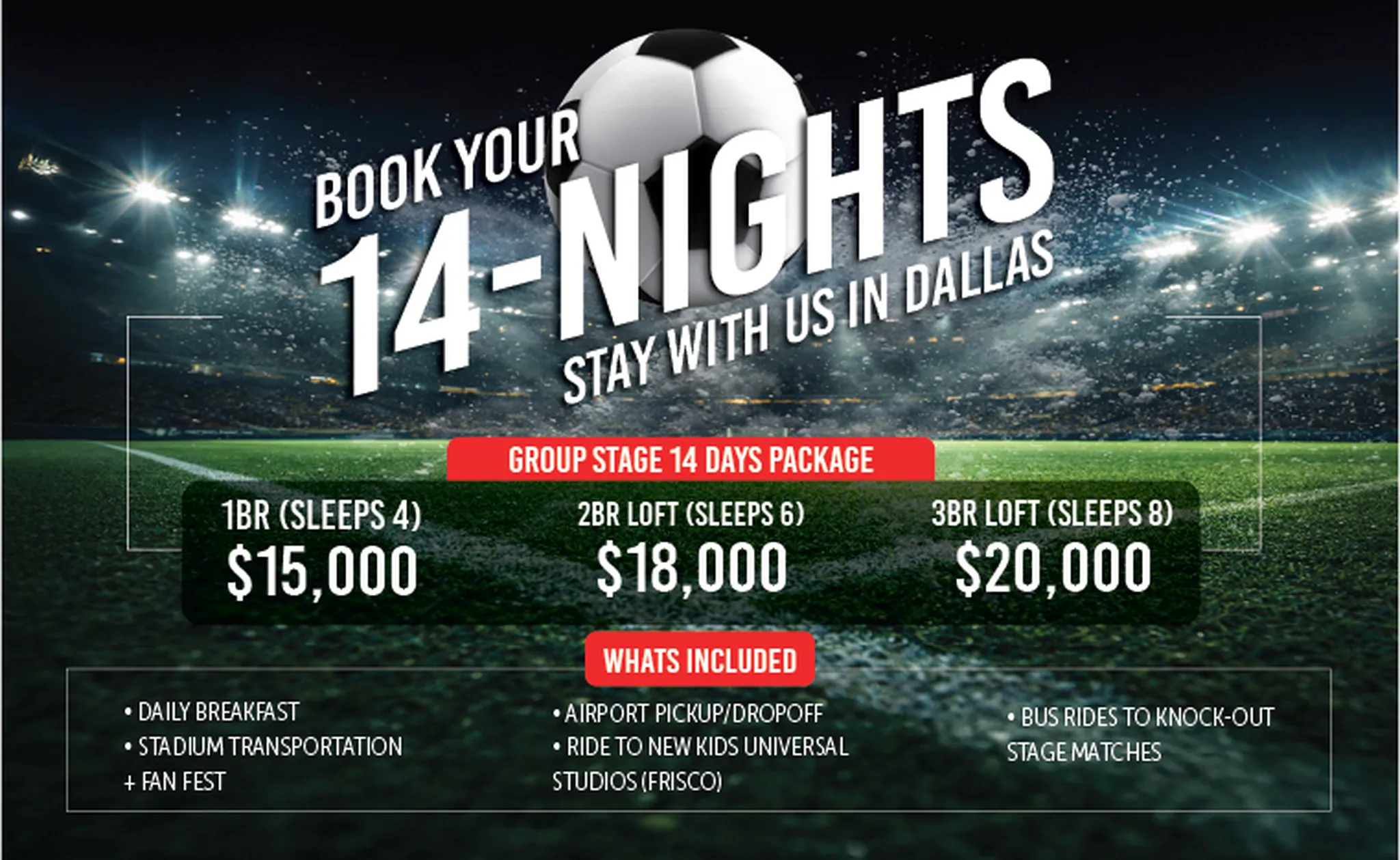Stay with us for 5-nights, 7-nights, or 14-nights with our World Cup specials. Each option includes spacious and comfortable accommodation, right in the heart of Dallas and nearby the stadium for easy access to and from the matches you’re watching.