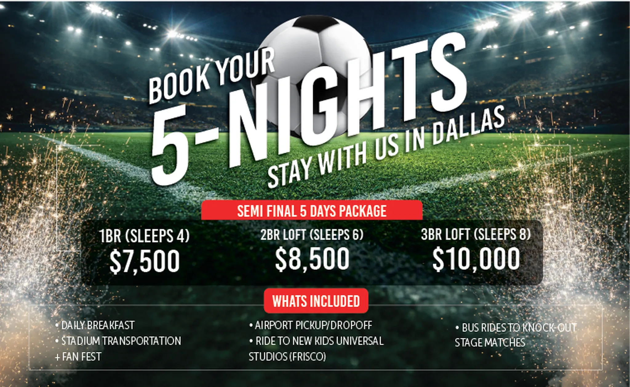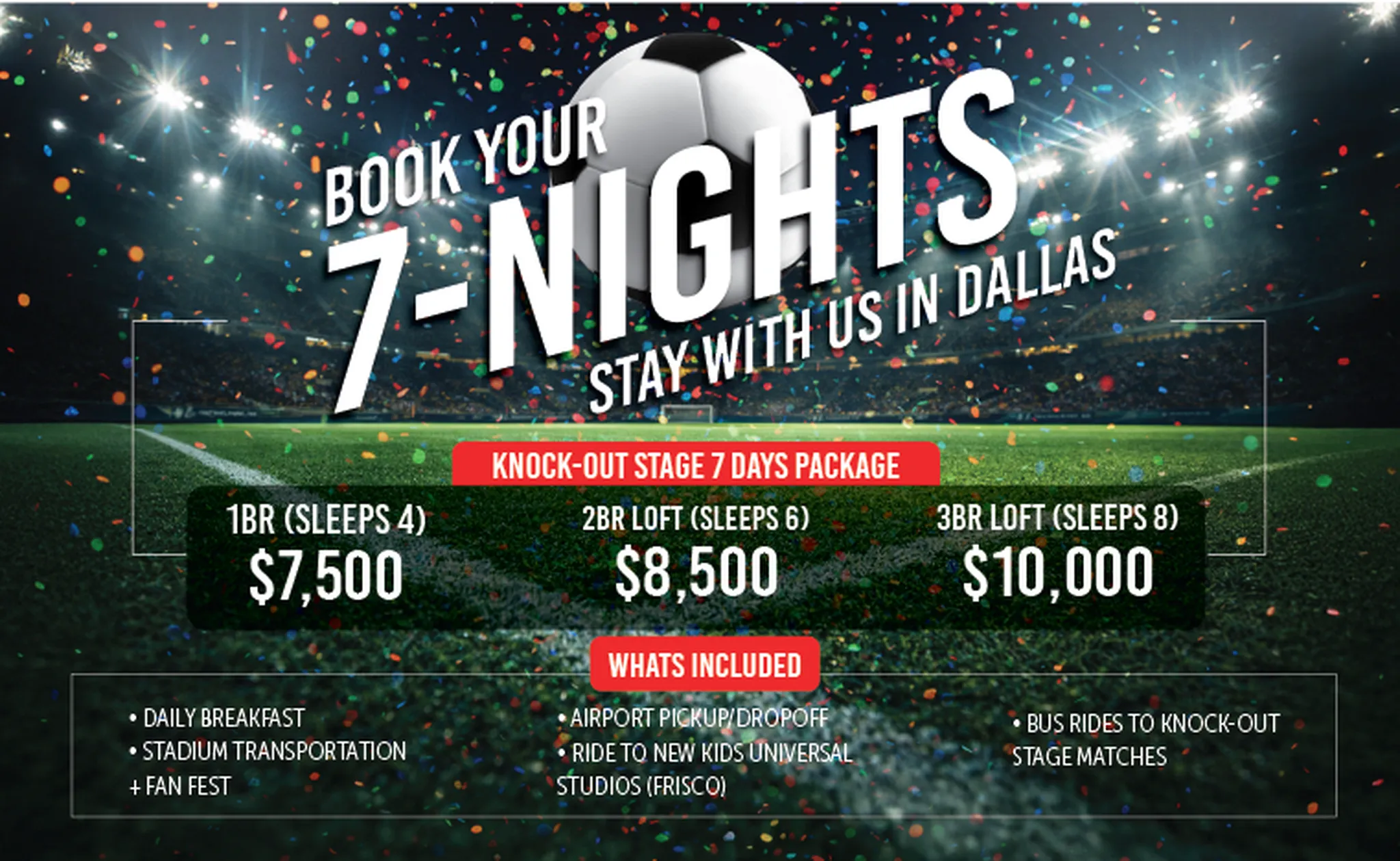 Fill out this quick form with your information and we’ll reach out directly to help you iron out your plans for Dallas’ World Cup and secure your premium accommodation.